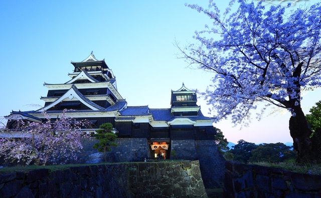 熊本城是日本三名城之一,又名銀杏城。規模壯觀,以「倒武者」的石牆最為出名。在800棵櫻花盛開的時節,花瓣間黑白相間的天守閣添上一抹優雅。