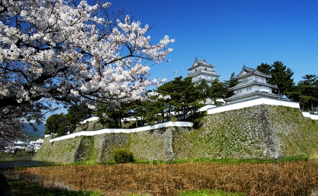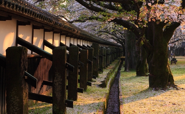 1618 年建造共五層高的島原城,護城河畔長達1.3km,環繞城牆一圈分佈著250棵櫻花,春天時開滿粉嫩的櫻花道。城西側的武家屋敷,還保留著江戶時代的宅邸遺跡,道路間的水道,櫻花垂落黑色的房瓦上,別具和式情調。