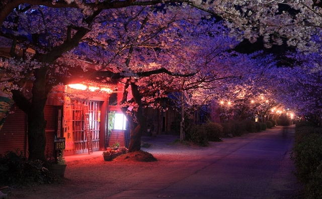 夜晚的特別燈光下,櫻花的色澤更添優美。