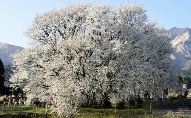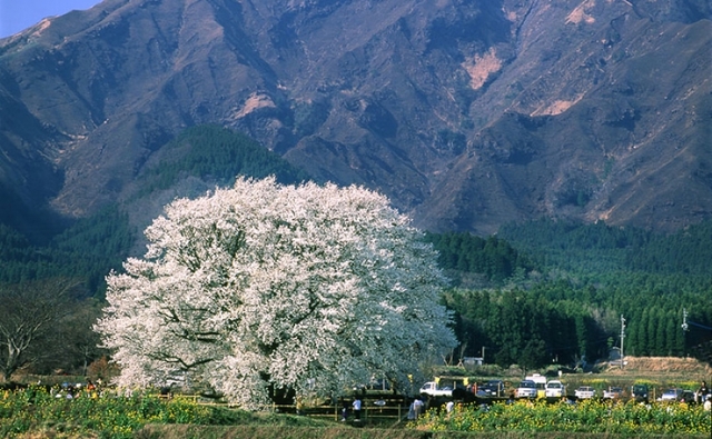 九州最著名的櫻花古樹就要數阿蘇一心行的大櫻花樹,樹齡已達400年。這棵大山櫻高達14公尺,枝椏東西寬21公尺,南北寬26公尺,在日本來說也是最大級別的櫻花樹了。夜晚燈光映照下,花苞格外粉紅通透。