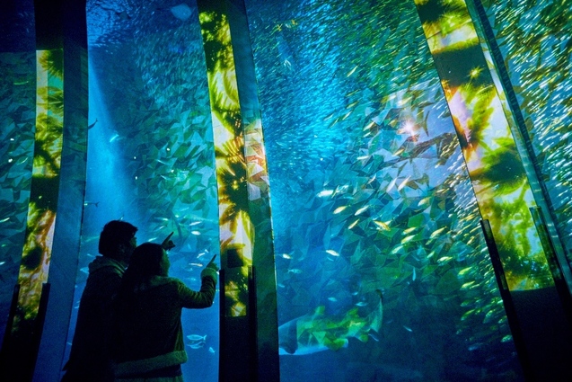 横滨八景岛上的海岛乐园一向是日本着名的水族馆游乐园之一,五光十色的水底世界每年都吸引数以万计的游人。今年冬天馆方和创作公司NAKED合作,华丽的灯饰将乐园化为水底森林!主水槽「热带水底森林」,高8米半,储水量达1500吨,更装上最先进的「万花筒屏幕」,光线投影随时间转变,日夜分明,流光溢彩。