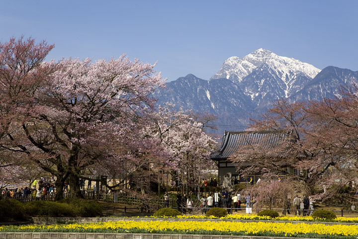 树龄高达2000年,位于北杜市武川町实相寺的山高神代樱,是全日本最古老最巨大的江户彼岸樱。相传神代樱是由古代皇族日本武尊东征时所种,又因圣人许愿而再生,又名「妙法樱」。樱树的週围亦种满了近8 万株黄水仙,鲜黄粉红相映,令人难以忘怀呢。于开花期在 樱树旁更加会举办为期约一个月的祭典,售有各种地道食品,农产品、手工艺 品和手信。