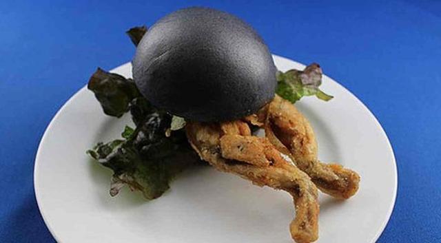 離東京不過二十分鐘火車的橫演,近來有超聳動的青蛙漢堡。搞咩?因為世界首間Orbi Yokohama體驗自然博物館,將於3月21日至5月17日推出有毒動物展,展出25種世界有毒動物。館方「毒Cafe」也配合在推出特色油炸「青蛙漢堡」,兩條腿伸出來,令人嚇一跳。漢堡包加入了竹炭色素,每個要價1000円,限量發售。真心挑戢食的極限!還有以杏仁豆腐及啫喱製成的青蛙卵甜品。