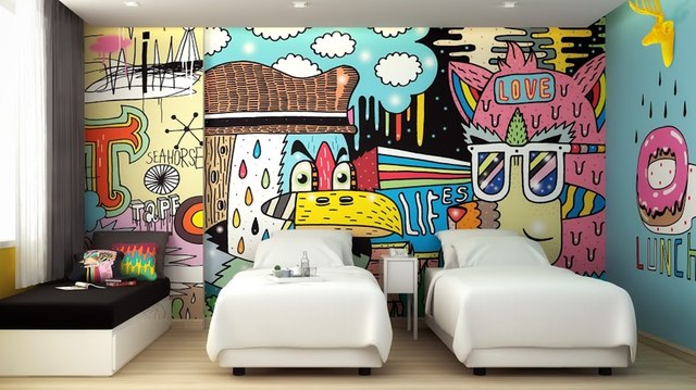 酒店楼高四层,共有五十多间房间。每间房间均有不同设计,墙身各有普普艺术风格的涂鸦、黑白花纹设计、人像线描,简单俐落的设计感,窗明几净,空间感十足,让人惊喜。房间设施亦颇为齐全,风筒、电视、冰箱、咖啡机等等。现在订房还有优惠,两晚送一晚。