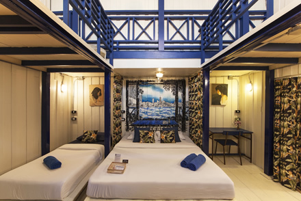 广受世界各地旅客欢迎的Loy La Long Hotel,以浪漫怀旧的水上情调闻名。位处曼谷心脏地带中国城,酒店就座落于湄南河上的一座三十年木屋,隔着河水上的灯火掠影,窗外随时望到夕阳。两层高,共有七间房,每间房都以不同色调为主题,中国红配古典装潢、希腊蓝、幽黑。古木装潢、古董中国洗浴设备、随时面向河岸风景、低矮的大床,房间离河水只有一两米,让人感受真实独特的水上情调。选择入住河畔客房的住客可以在夜晚,开着窗廉,迎着阵阵微风入眠。