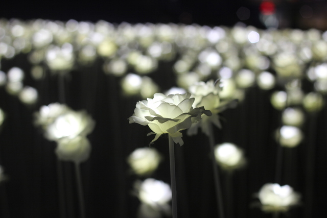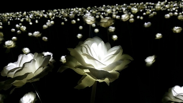 在中庭盛放的25550朵白玫瑰,在夜间点亮,一片点点灯火如星,简直是奇幻如阿凡达潘朵拉星球才会出现的场景。虽然旁边有围栏保护花朵,但在外围拍照,也已经超美。